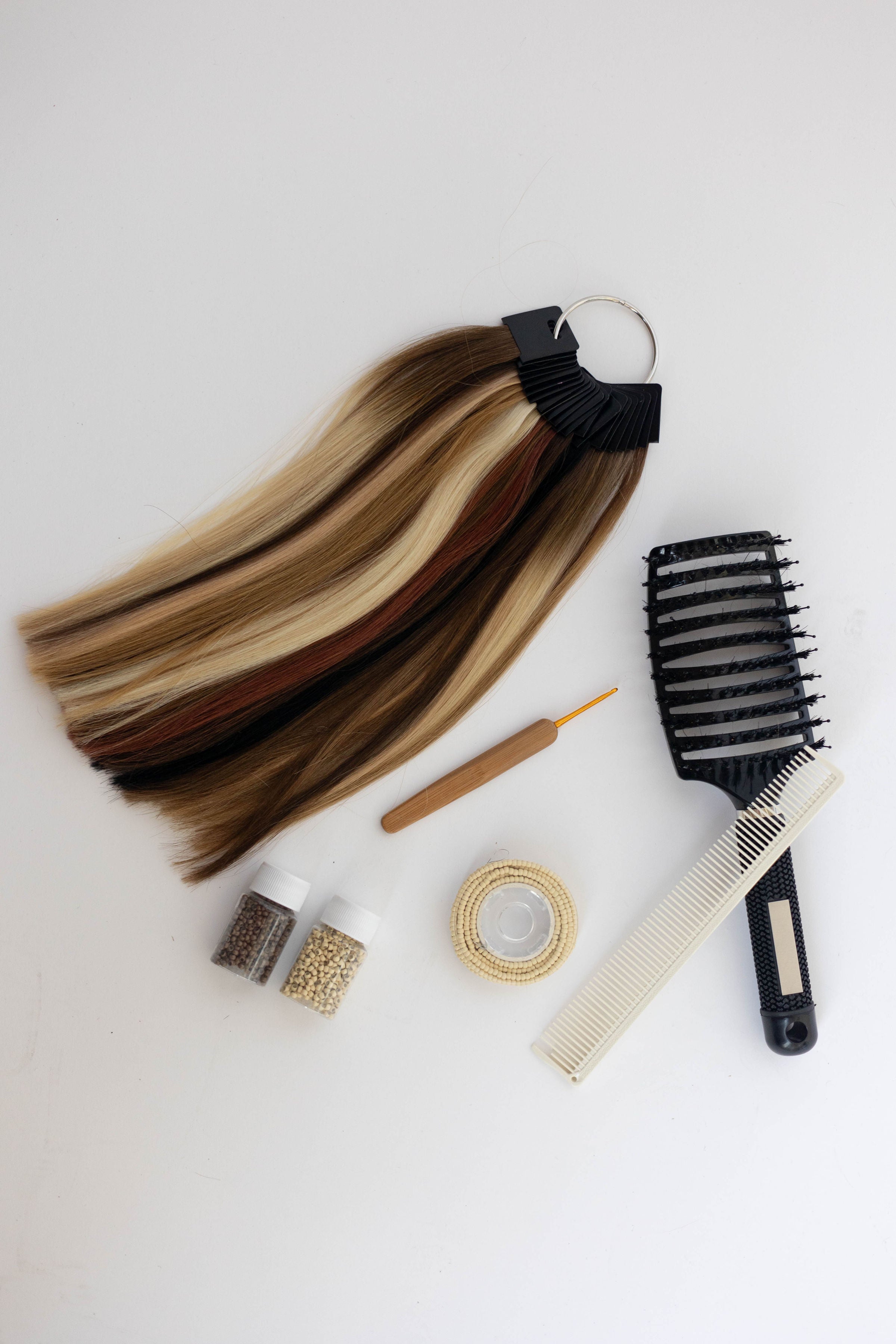 Your Select Starter Kit comes with everything you need for your first install - a full 100g pack of premium hair, a complimentary full-size swatch ring, and the core tools for a flawless application.